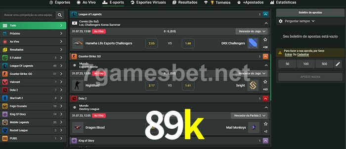 A aposta 89k oferece aos jogadores a experiência mais conveniente de apostas em eSports!